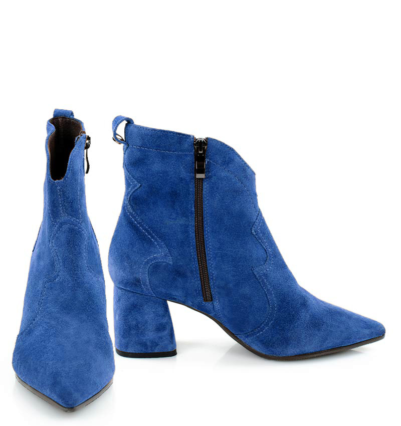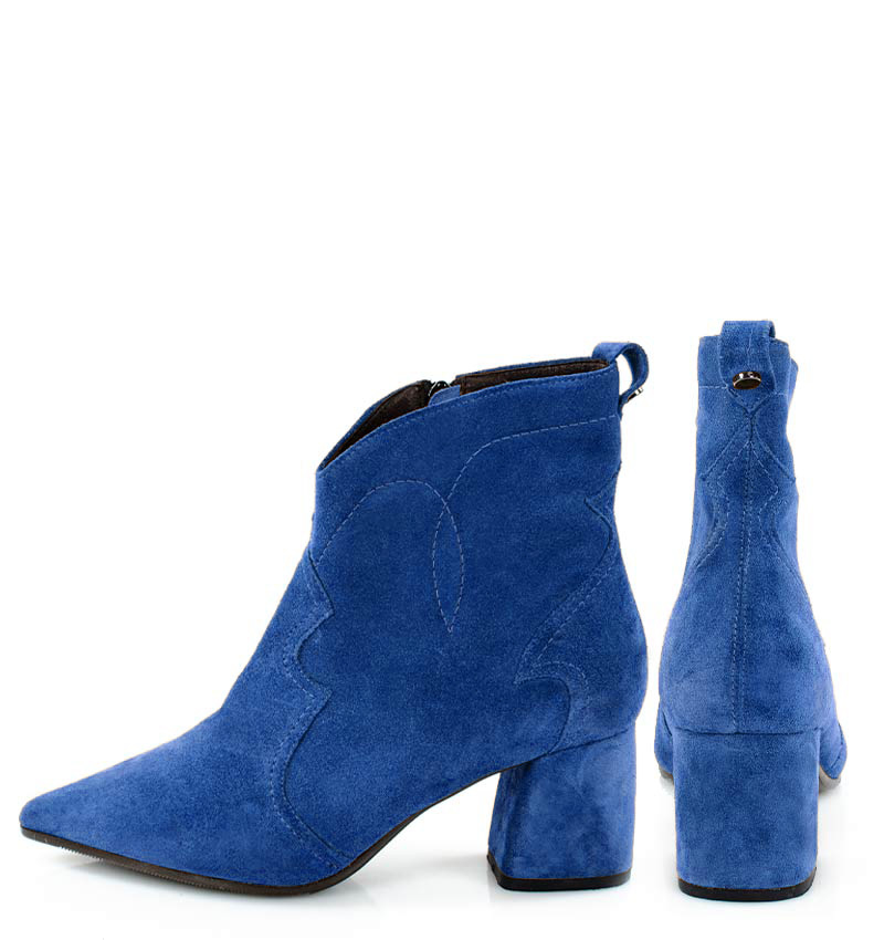 PEGGY – Niebieskie botki na stabilnym 6,5 cm słupku (wysokość obcasa jest mierzona w rozmiarze 37). Cholewka za kostkę wykonana z welurowej skóry naturalnej, ozdobiona motywem klasycznych kowbojek. Nosek w szpic wysmukla sylwetkę buta. Zapinane na zamek, dzięki czemu są wygodne w zakładaniu. Botki nie ocieplone, dzięki czemu będą idealne na ciepłe jesienno-zimowe dni. Czubek w migdałowy. Tęgość butów: F 1/2. Wnętrze butów i wkładka wykonane są ze skóry naturalnej.