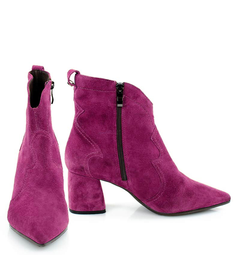 PEGGY – Różowe botki na stabilnym 6,5 cm słupku (wysokość obcasa jest mierzona w rozmiarze 37). Cholewka za kostkę wykonana z welurowej skóry naturalnej, ozdobiona motywem klasycznych kowbojek. Nosek w szpic wysmukla sylwetkę buta. Zapinane na zamek, dzięki czemu są wygodne w zakładaniu. Botki nie ocieplone, dzięki czemu będą idealne na ciepłe jesienno-zimowe dni. Czubek w migdałowy. Tęgość butów: F 1/2. Wnętrze butów i wkładka wykonane są ze skóry naturalnej.