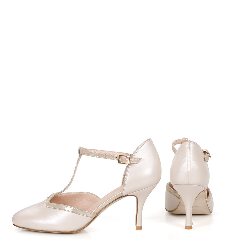 PENELOPE – Czółenka beżowe do tańca ze złotym paskiem t-strap. Obcas o wysokości 7,5 cm (wysokość obcasa jest mierzona dla rozmiaru 37). Buty dedykowane do tanga i tańca towarzyskiego, choć chętnie kupowane również do łaciny. Podeszwa skórzana ze skóry licowej. Penelope to wygodne buty do tańca oraz ze względu na zgrabny obcas są to również idealne buty na wesele. Cholewka wykonana ze skóry naturalnej. Czółenka zapinane na sprzączkę.