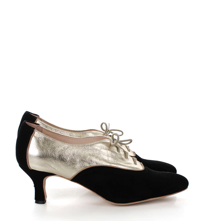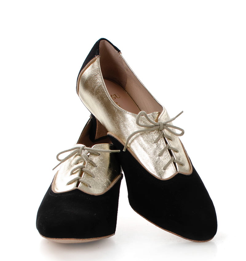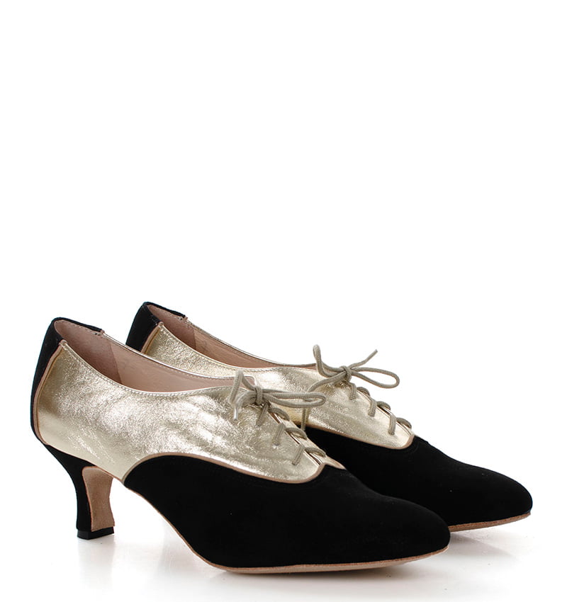 PILAR – Czarn0-złote buty treningowe na 5,5 cm obcasie (wysokość obcasa jest mierzona dla rozmiaru 37). Buty dedykowane do ćwiczeń tanga i tańców towarzyskich. Podeszwa skórzana welurowa, dzięki czemu jest elastyczna i miękka. PILAR to wygodne buty sznurowane do ćwiczeń oraz do tańca klasycznego. Buty dobrze wyglądają do spódnico-spodni. Ze względu na welurową podeszwę, buty te nie nadają się do chodzenia po chodniku i są przeznaczone wyłącznie na parkiet.