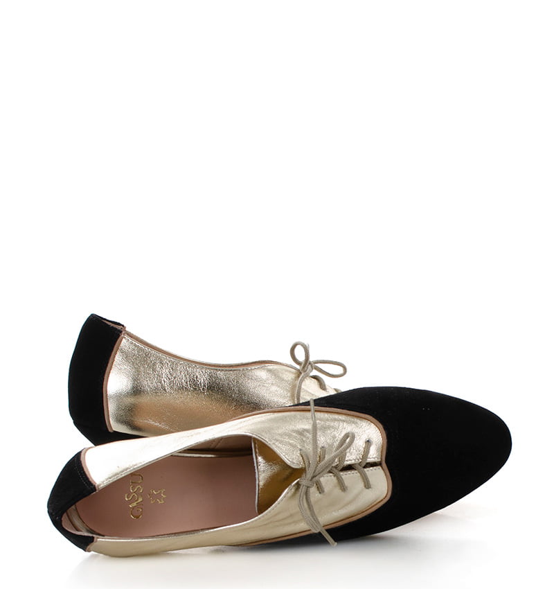– Cholewka: czarny zamsz + złote lico