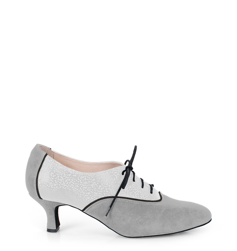 PILAR – Szaro białe buty treningowe na 5,5 cm obcasie (wysokość obcasa jest mierzona dla rozmiaru 37) z czarną lamówką. Buty dedykowane do ćwiczeń tanga i tańców towarzyskich. Podeszwa skórzana welurowa, dzięki czemu jest elastyczna i miękka. PILAR to wygodne buty sznurowane do ćwiczeń oraz do tańca klasycznego. Buty dobrze wyglądają do spódnico-spodni. Ze względu na welurową podeszwę, buty te nie nadają się do chodzenia po chodniku i są przeznaczone wyłącznie na parkiet.