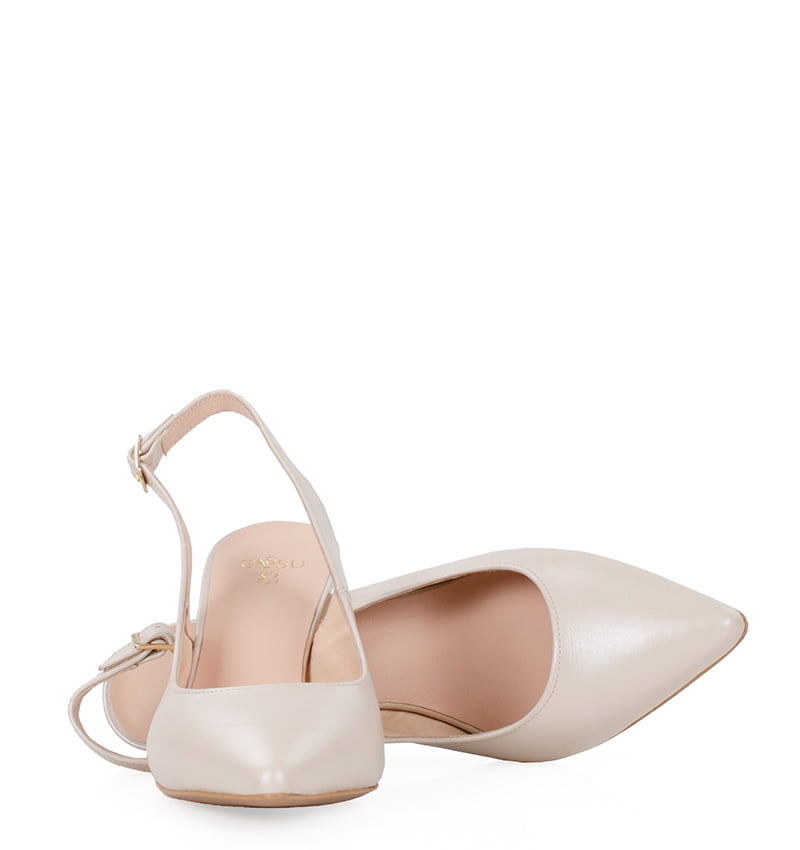 POLA – Beżowe szpilki z odkrytą piętą, na 8 cm obcasie (wysokość obcasa jest mierzona w rozmiarze 37). Czubek w szpic, zapinane na pasek z klamerką. Buty wykonane z naturalnej skóry licowej układającej się do stopy. Średnia wysokość obcasa i licowa skóra, sprawia, że są to wygodne szpilki z odkrytą piętą. Tęgość butów to F 1/2. Beżowe szpilki pięknie prezentują się do sukni ślubnych i kreacji wizytowych.