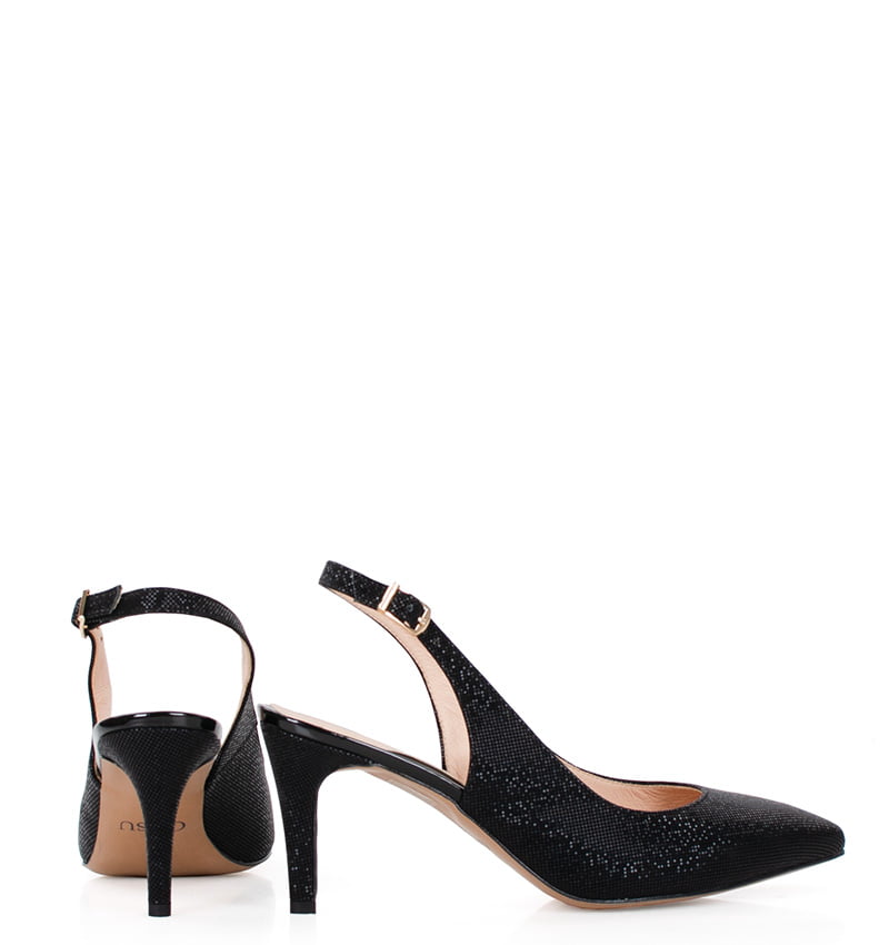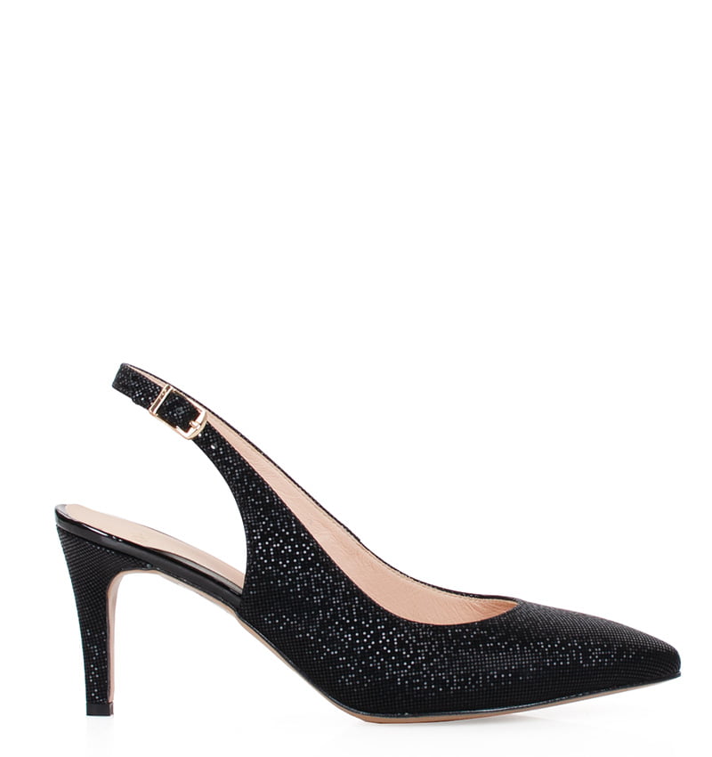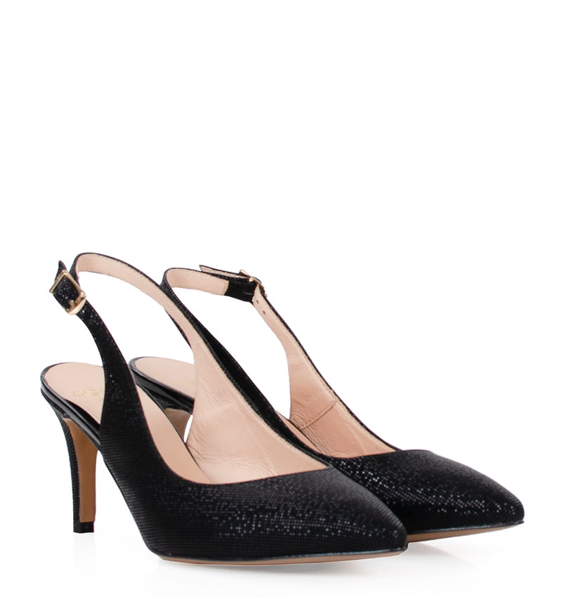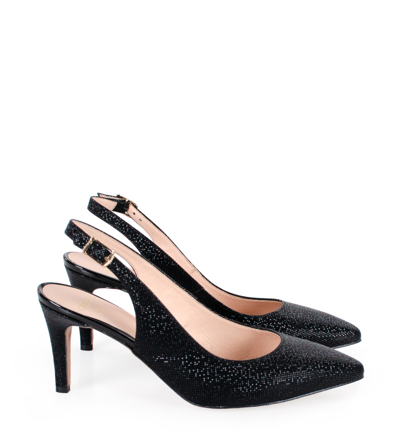 POLA – czarne, błyszczące szpilki z odkrytą piętą, na 8 cm obcasie (wysokość obcasa jest mierzona w rozmiarze 37). Czubek w szpic, zapinane na pasek z klamerką. Buty wykonane z naturalnej skóry układającej się do stopy. Średnia wysokość obcasa sprawia, że są to wygodne szpilki z odkrytą piętą. Tęgość butów to F 1/2. Czarne szpilki pięknie prezentują się do sukni ślubnych i kreacji wizytowych.