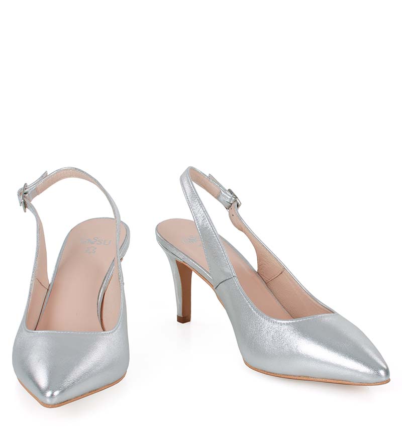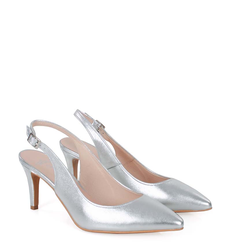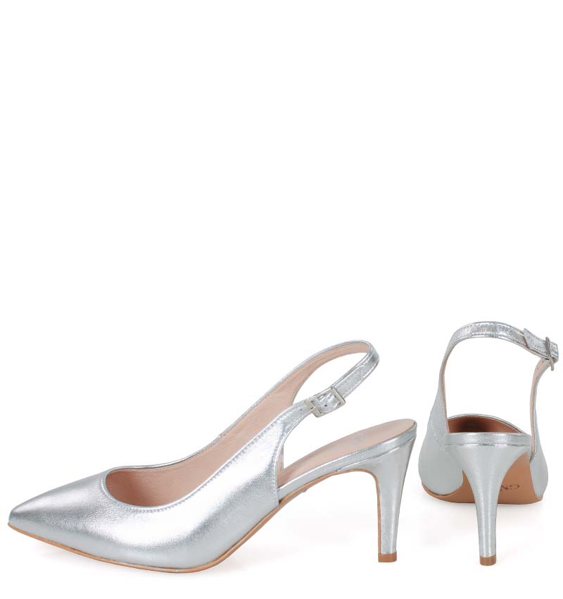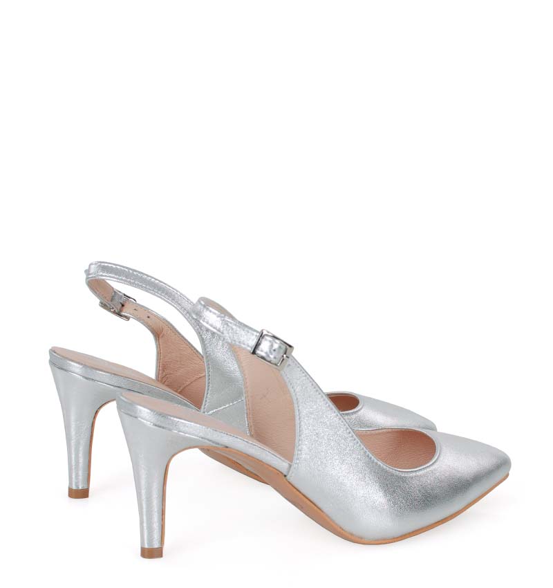 POLA –  Srebrne szpilki z odkrytą piętą, na 8 cm obcasie (wysokość obcasa jest mierzona w rozmiarze 37). Czubek w szpic, zapinane na pasek z klamerką. Buty wykonane z naturalnej skóry licowej układającej się do stopy. Średnia wysokość obcasa i licowa skóra, sprawia, że są to wygodne szpilki z odkrytą piętą. Tęgość butów to F 1/2. Srebrne szpilki pięknie prezentują się do sukni ślubnych i kreacji wizytowych.
