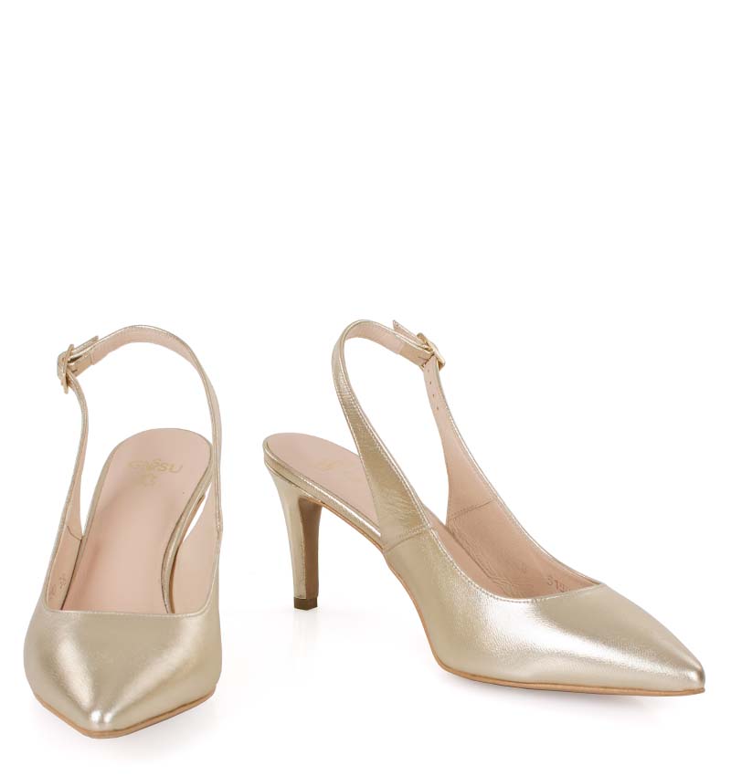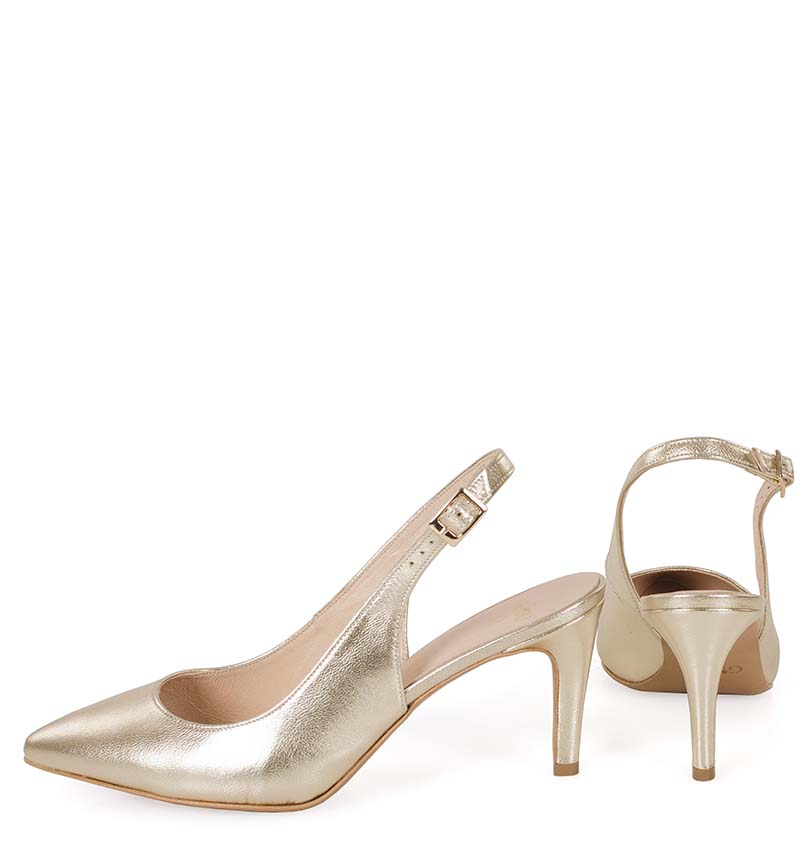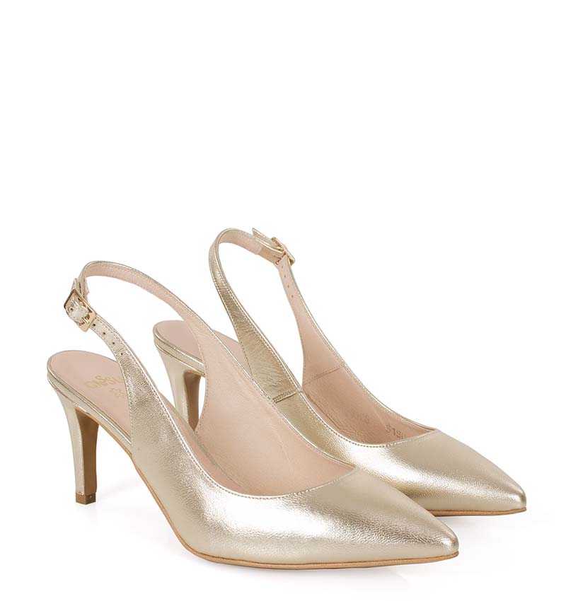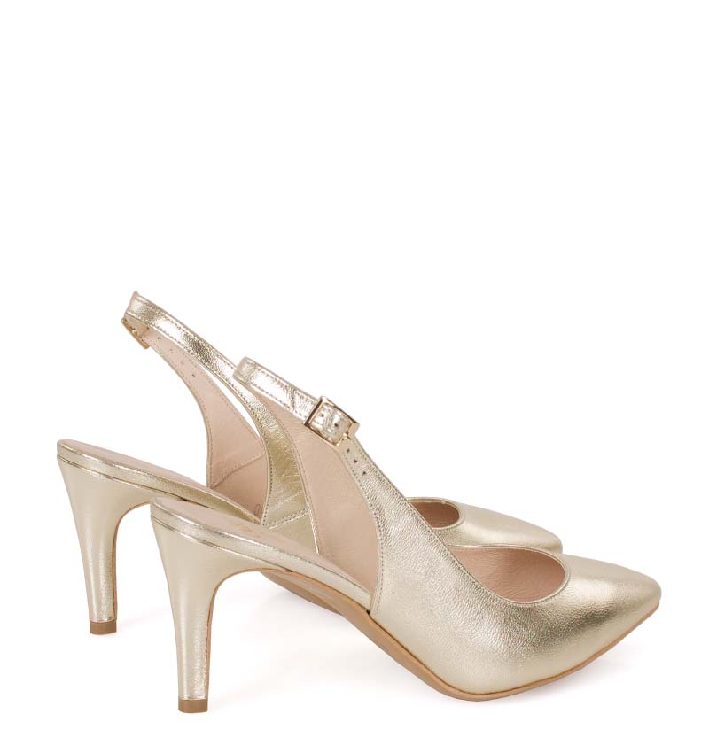 POLA – Złote platynowe szpilki z odkrytą piętą, na 8 cm obcasie (wysokość obcasa jest mierzona w rozmiarze 37). Czubek w szpic, zapinane na pasek z klamerką. Buty wykonane z naturalnej skóry licowej układającej się do stopy. Średnia wysokość obcasa i licowa skóra, sprawia, że są to wygodne szpilki z odkrytą piętą. Tęgość butów to F 1/2. Złote szpilki pięknie prezentują się do sukni ślubnych i kreacji wizytowych.