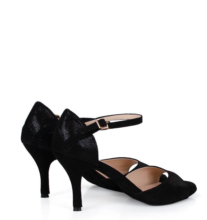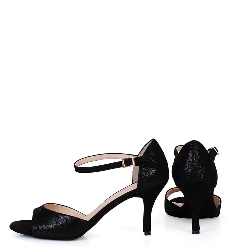 RAMONA  Czarne sandałki do tańca na skórzanej podeszwie. Buty sprawdzą się doskonale do tanga, standardu czy latino. Podeszwa wykonana ze skóry welurowej, dzięki czemu zapewnia odpowiedni poślizg. Ramona w wersji widocznej na zdjęciu, posiada pasek zapinany na sprzączkę. Obcas o wysokości 7,5 cm (wysokość obcasa jest mierzona dla rozmiaru 37).