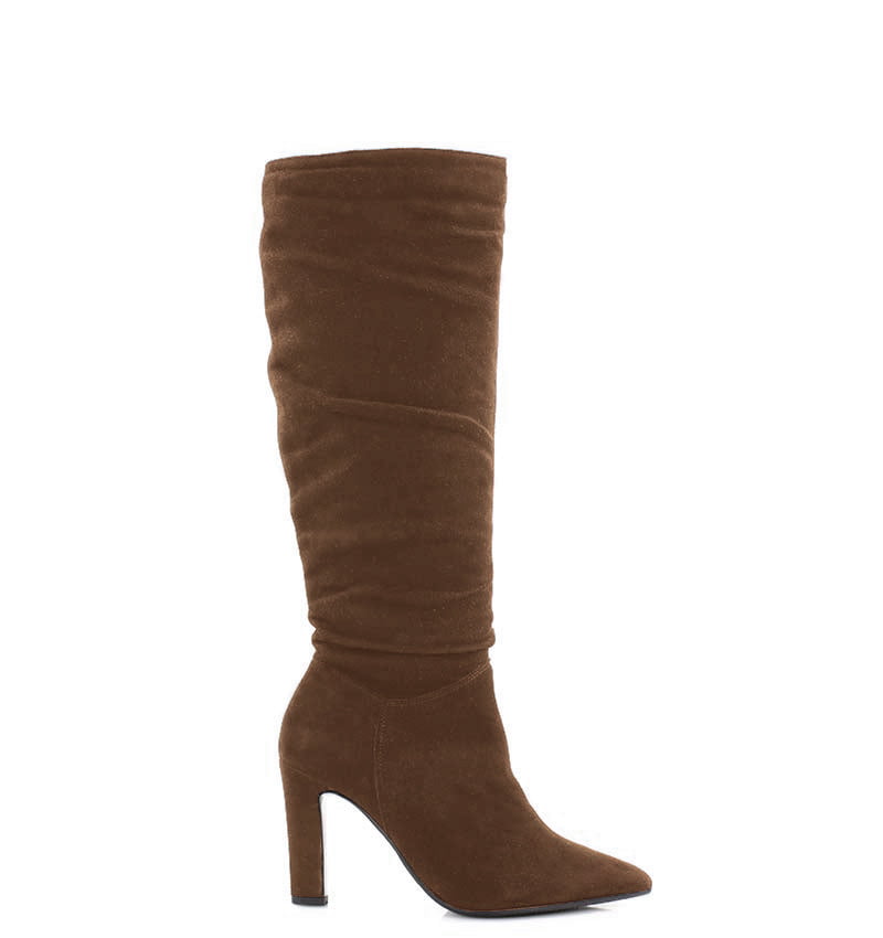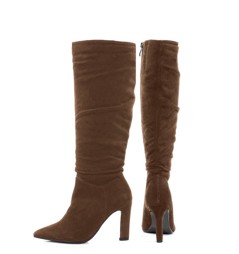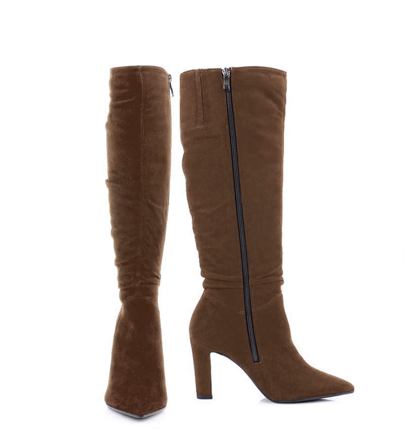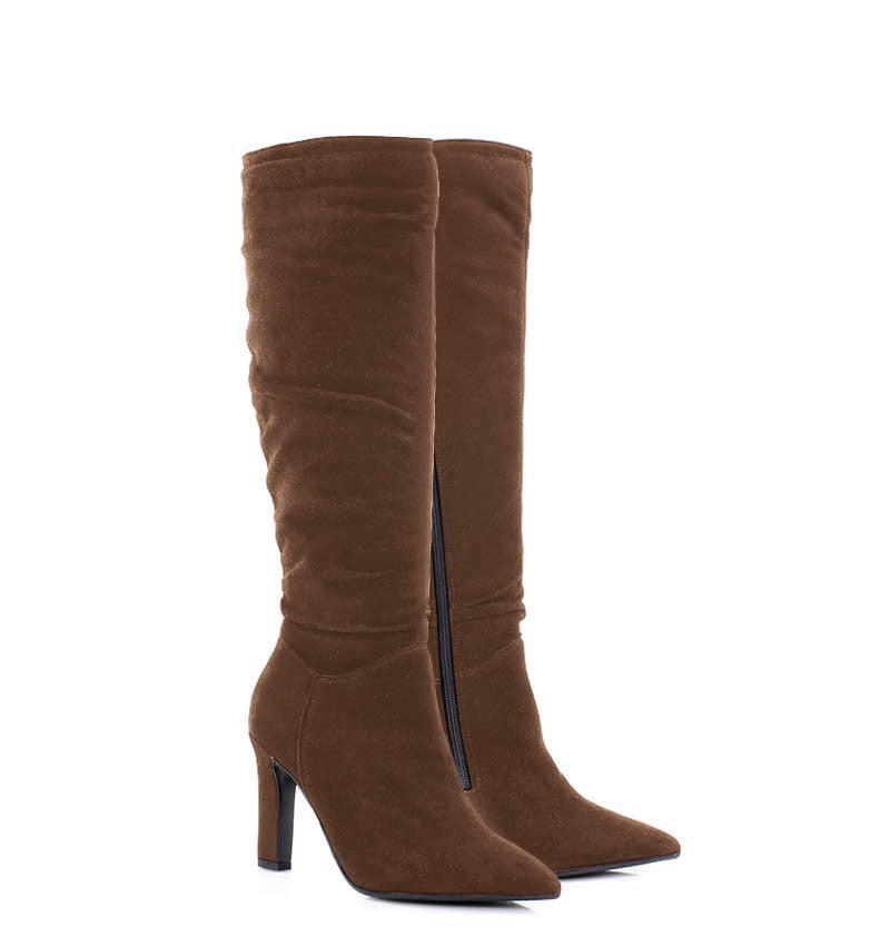 ROSE – Ciemno brązowe kozaki do kolana na cienkim, wysokim na 9,5 cm słupku. Wysokość (długość) cholewki to 40 cm, (mierzona z tyłu od końca obcasa w górę). Kozaki zapinane na zamek. Cholewka wykonana z naturalnej skóry welurowej układającej się do stopy. Tęgość butów: G. Wnętrze butów ocieplone cienkim kocem obuwniczym.