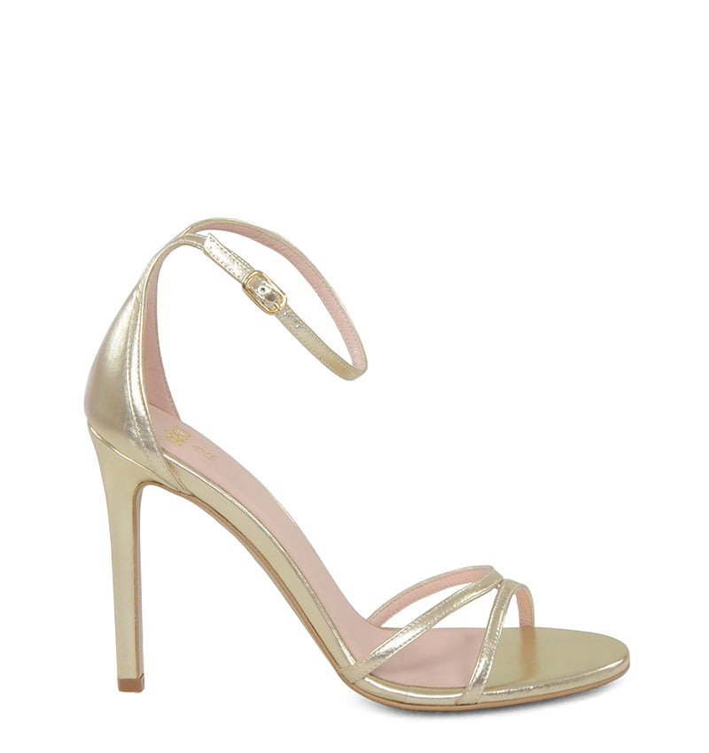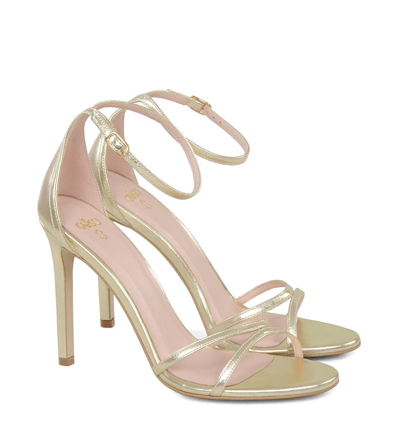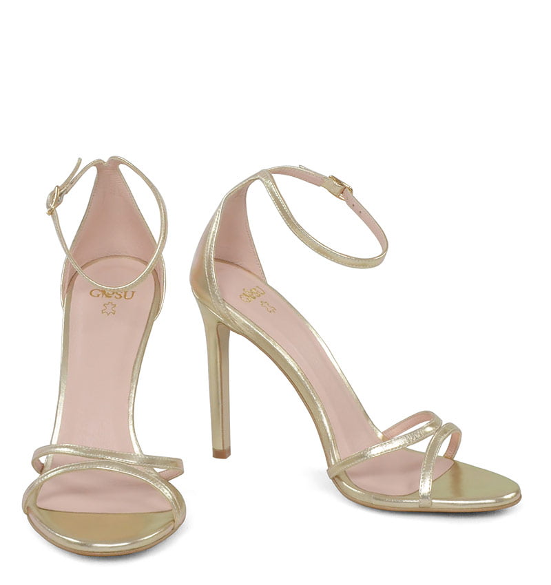 SOPHIA – Złote licowe wysokie sandałki na szpilce z paskiem wokół kostki. Cholewka w postaci cienkich paseczków w części palcowej i zakrytej pięty. Wysokość obcasa 10,5 cm jest mierzona w rozmiarze 37. Cholewka wykonana z naturalnej skóry licowej. Wysoka szpilka sprawia, że sandałki wyglądają efektownie. Tęgość butów: F1/2. Wnętrze butów i wkładka wykonane są ze skóry naturalnej.