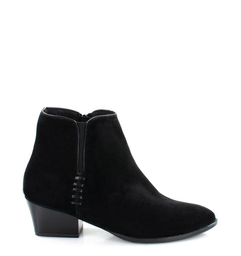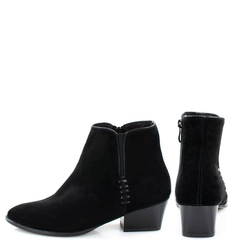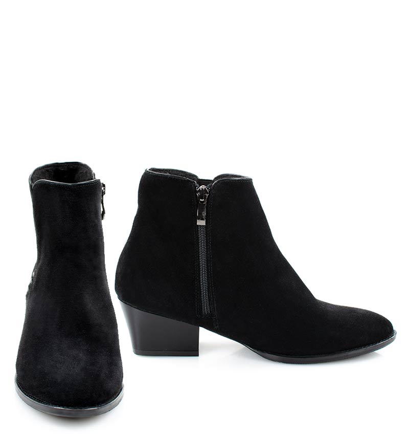 TAYLOR – Czarne botki za kostkę, na 5,5 cm obcasie. (wysokość obcasa jest mierzona w rozmiarze 37). Botki wykonane z welurowej skóry naturalnej. Czubek migdałowy. Niska wysokość obcasa sprawia, że są to bardzo wygodne botki na słupku. Tęgość butów: G. Wnętrze butów jest lekko ocieplone cienkim kocem obuwniczym.
