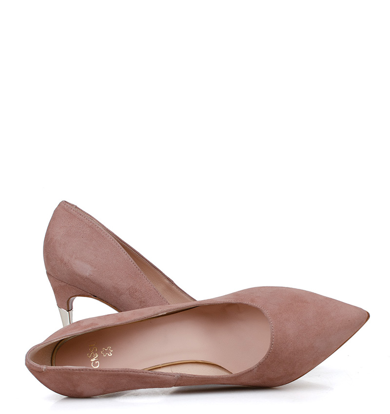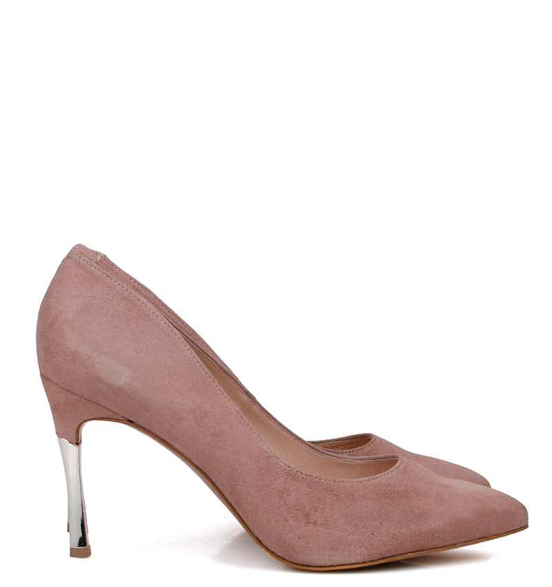 TRISH – Zamszowe szpilki w kolorze beżowym z odcieniem różu. Buty na 9,5 cm obcasie (wysokość obcasa jest mierzona w rozmiarze 37). Czubek w szpic, złoty obcas . Buty wykonane z naturalnej skóry zamszowej układającej się do stopy. Tęgość butów: F 1/2. Wnętrze butów wykończone delikatną skórą naturalną.
