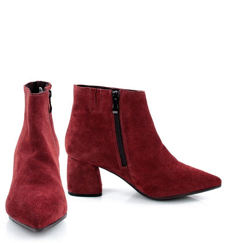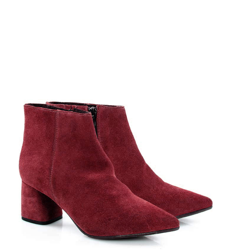 VERA –  Bordowe botki na 6,5 cm słupku (wysokość obcasa jest mierzona w rozmiarze 37). Czubek w szpic, zapinane na zamek . Buty wykonane z naturalnej skóry zamszowej układającej się do stopy. Średnia wysokość obcasa sprawia, że są to wygodne botki. Tęgość butów: G. Wnętrze butów ocieplone cienkim kocem obuwniczym.
