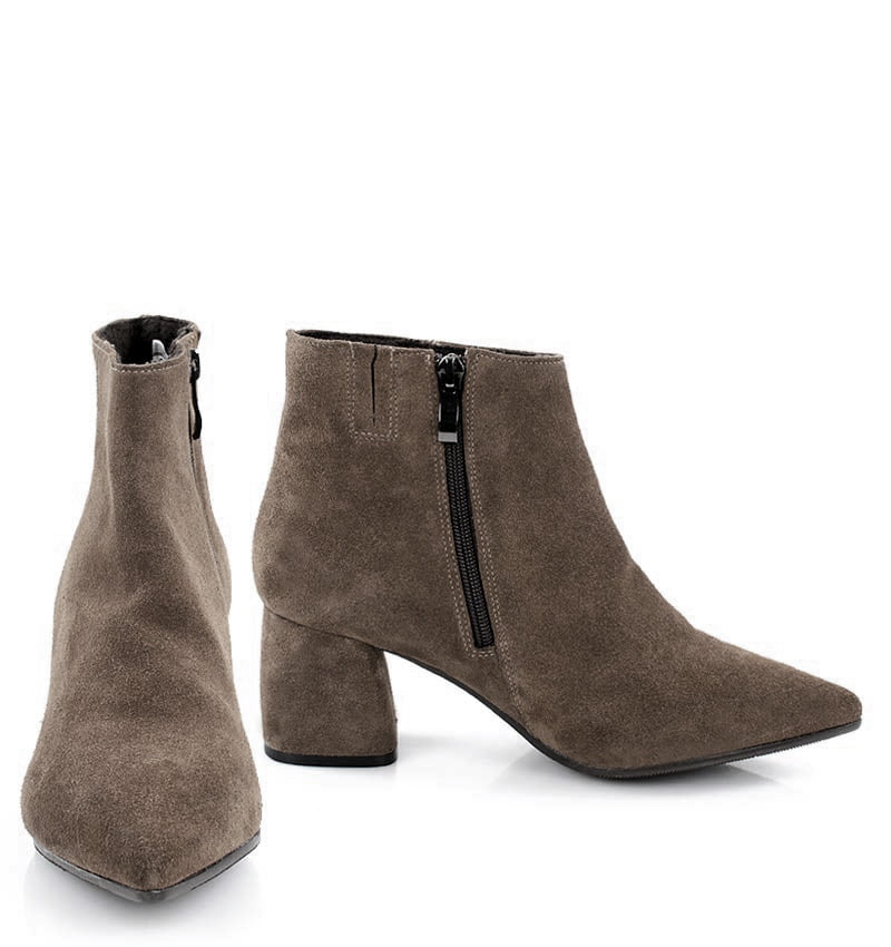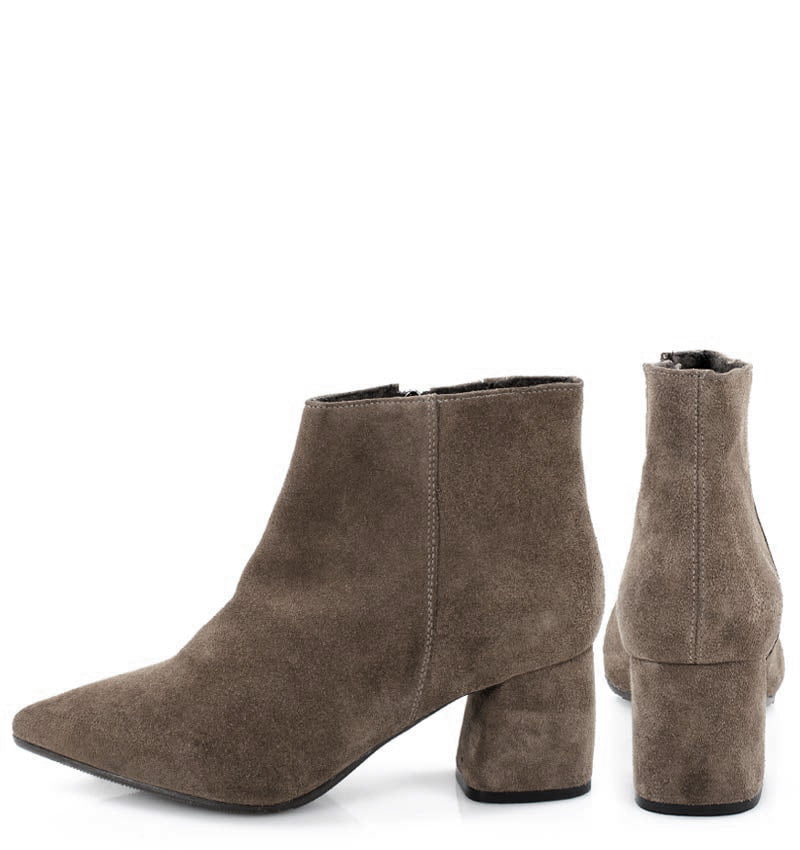 VERA – Ciemno beżowe botki na 6,5 cm słupku (wysokość obcasa jest mierzona w rozmiarze 37). Czubek w szpic, zapinane na zamek . Buty wykonane z naturalnej skóry welurowej układającej się do stopy. Średnia wysokość obcasa sprawia, że są to wygodne botki. Tęgość butów: G. Wnętrze butów ocieplone cienkim kocem obuwniczym.