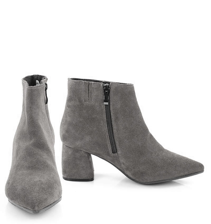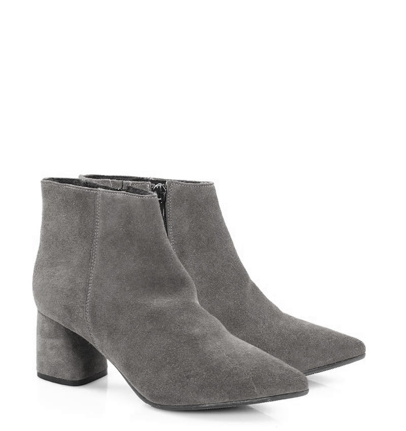 VERA –  Szare botki na 6,5 cm słupku (wysokość obcasa jest mierzona w rozmiarze 37). Czubek w szpic, zapinane na zamek . Buty wykonane z naturalnej skóry welurowej układającej się do stopy. Średnia wysokość obcasa sprawia, że są to wygodne botki. Tęgość butów: G. Wnętrze butów ocieplone cienkim kocem obuwniczym.