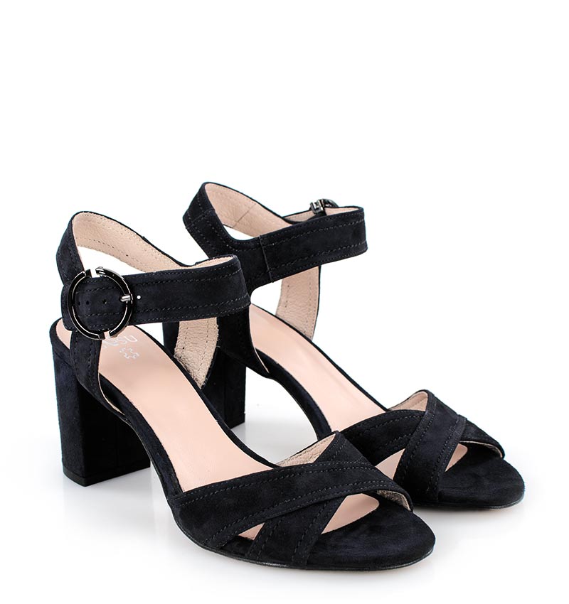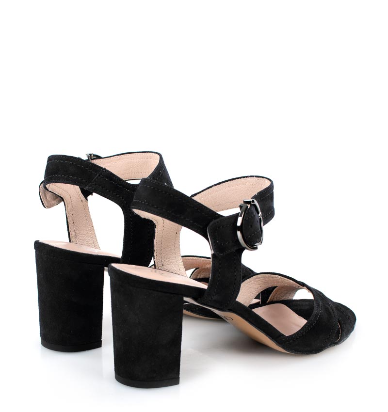 VIVIAN – Czarne sandałki na 7,5 cm słupku, wykonane z naturalnej skóry zamszowej, (wysokość obcasa jest mierzona w rozmiarze 37). Cholewka w postaci szerokich pasków dobrze trzyma stopę, dzięki czemu sandałki są wygodne. Tęgość butów to F 1/2.