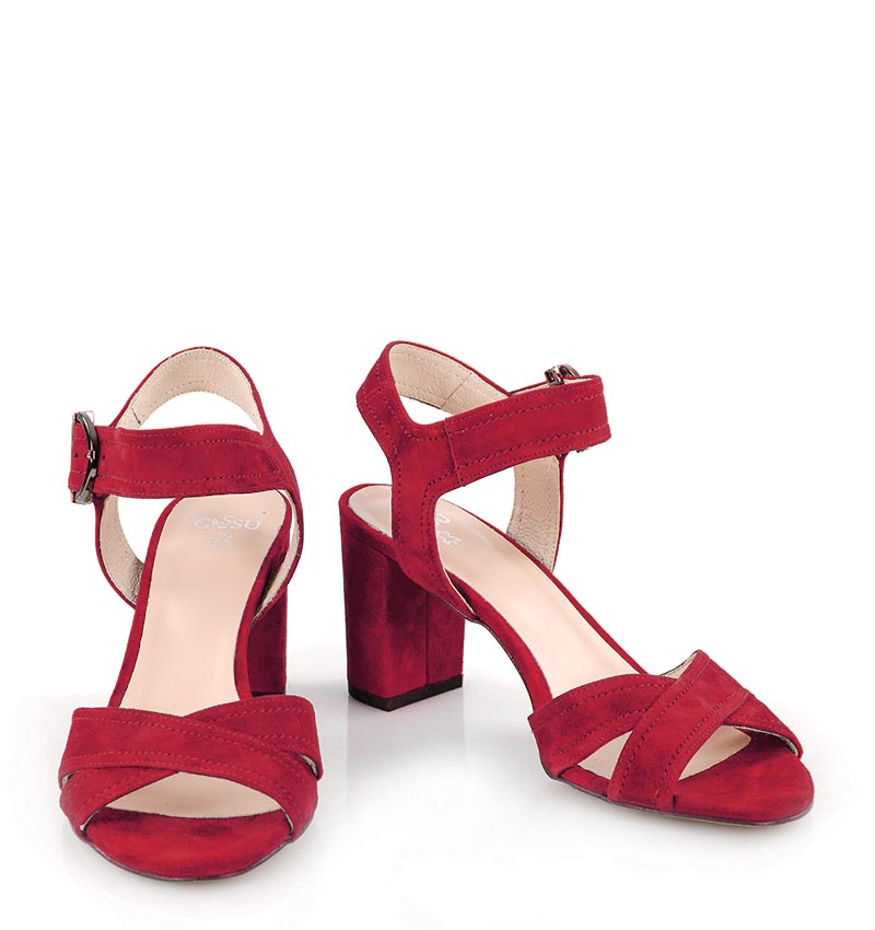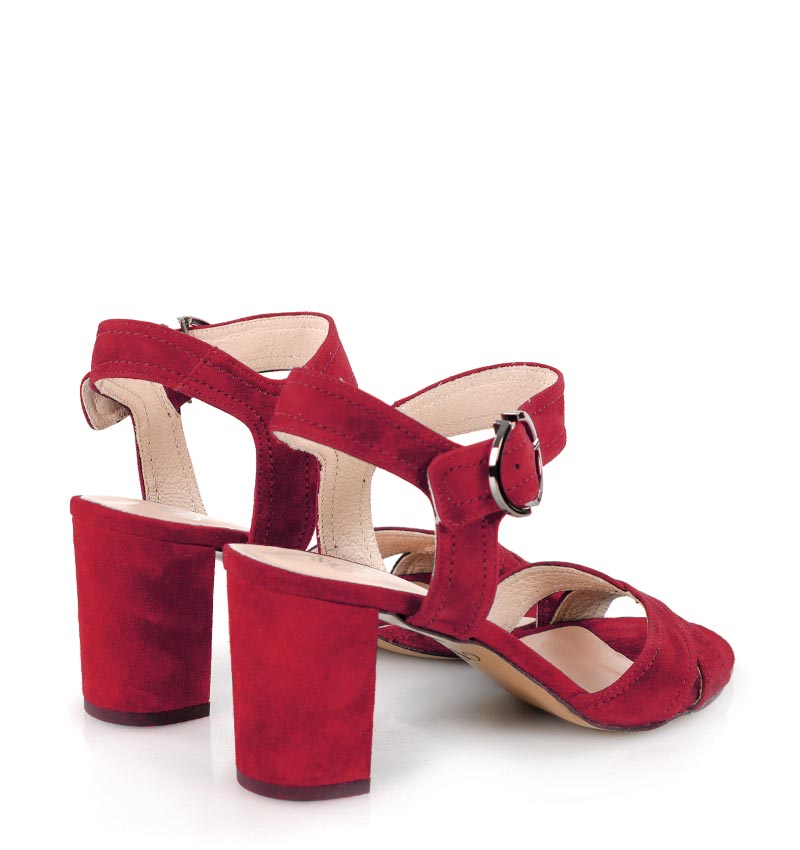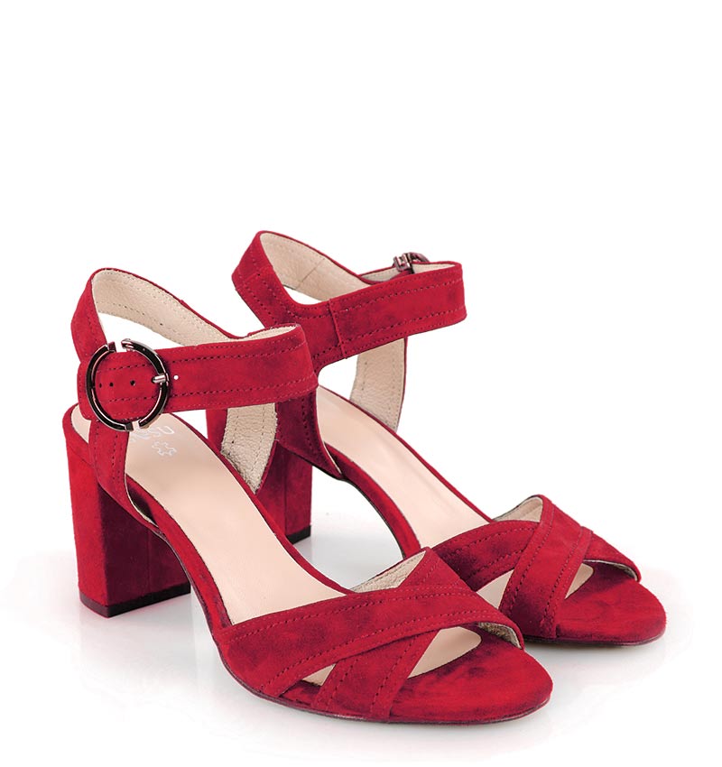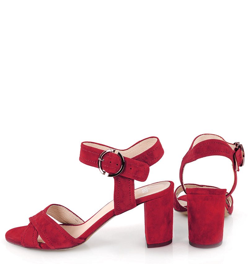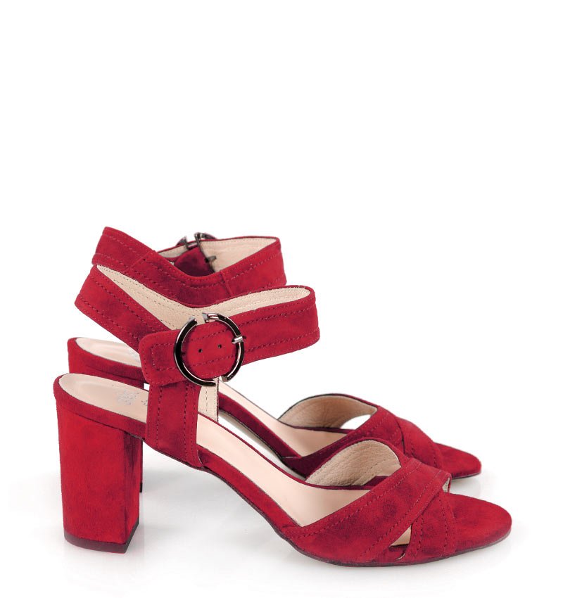 VIVIAN – Czerwone sandałki na 7,5 cm słupku, wykonane z naturalnej skóry zamszowej, (wysokość obcasa jest mierzona w rozmiarze 37). Cholewka w postaci szerokich pasków dobrze trzyma stopę, dzięki czemu sandałki są wygodne. Tęgość butów to F 1/2.