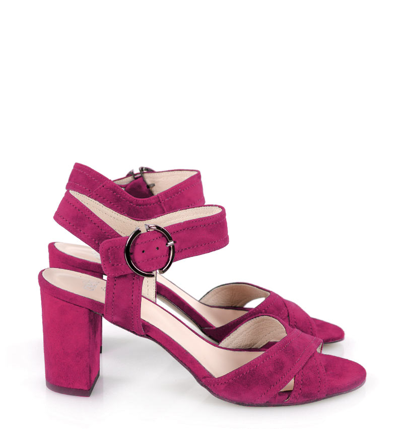 VIVIAN – Różowe sandałki na 7,5 cm słupku, wykonane z naturalnej skóry zamszowej, (wysokość obcasa jest mierzona w rozmiarze 37). Cholewka w postaci szerokich pasków dobrze trzyma stopę, dzięki czemu sandałki są wygodne. Tęgość butów to F 1/2.